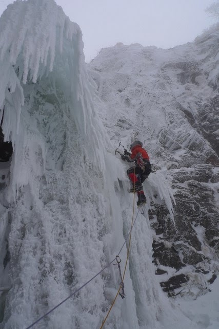 ジョウゴ沢大滝のつららの合間をリードするわたし(Y氏撮影)。